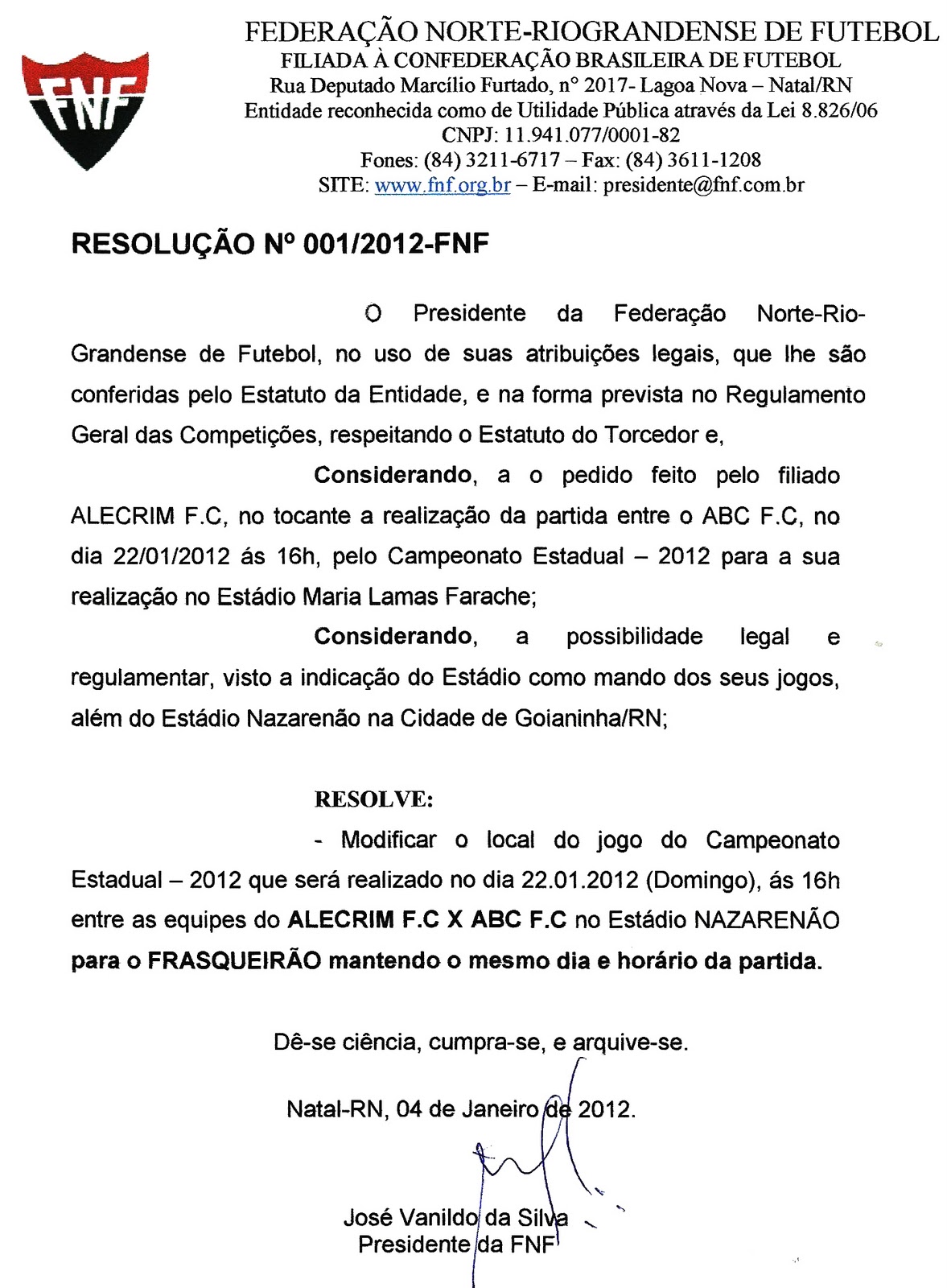 O presidente da FNF, Dr José Vanildo, torna público no sitio virtual da entidade, que a pedido da diretoria do Alecrim, ela (federação), modifica o local do jogo que o alviverde fará contra o ABC na 3ª rodada do estadual. Antes marcado para acontecer no estádio Nazarenão, o jogo acontece agora no Frasqueirão às 16h.